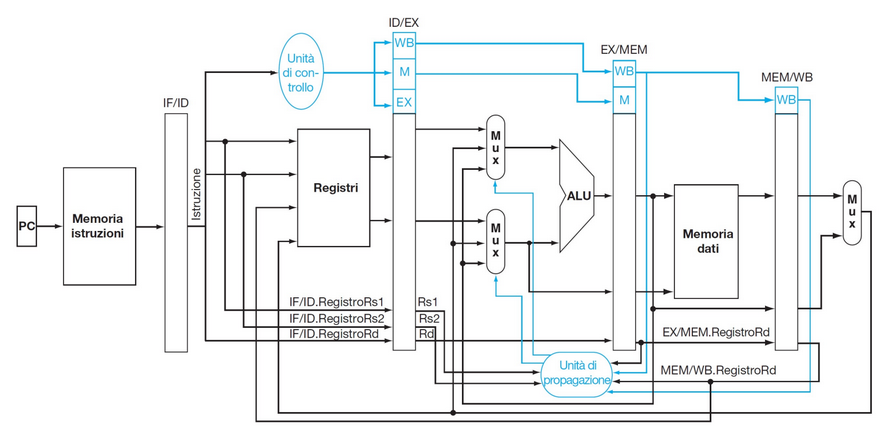 A volte, l’informazione necessaria per una fase di esecuzione di un’istruzione è già presente nella pipeline prima del Write Back. In questi casi si usa il forwarding (detto anche propagazione o bypassing), cioè l’inserimento di scorciatoie nel datapath, ovvero dei cavi che danno il dato all’unità funzionale che ne ha bisogno senza aspettare la fase di Write Back.