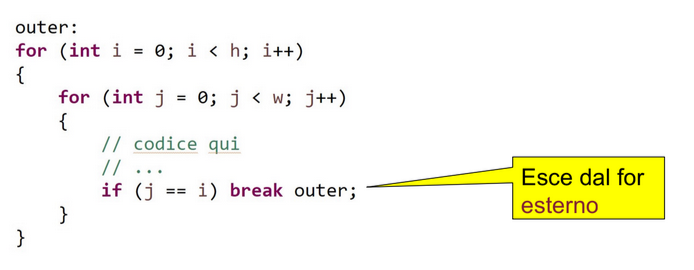 - L’istruzione break permette di uscire solo dal ciclo corrente se non si specifica un’etichetta, quindi come fare nel caso in cui si voglia uscire da una sequenza di cicli annidati?
