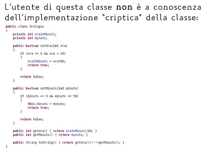 - Si creano delle “scatole nere”. Avendo meno informazioni a disposizione, si facilita il lavoro di gruppo e l’aggiornamento (maintenance) del codice. Inoltre il debug è più facile.