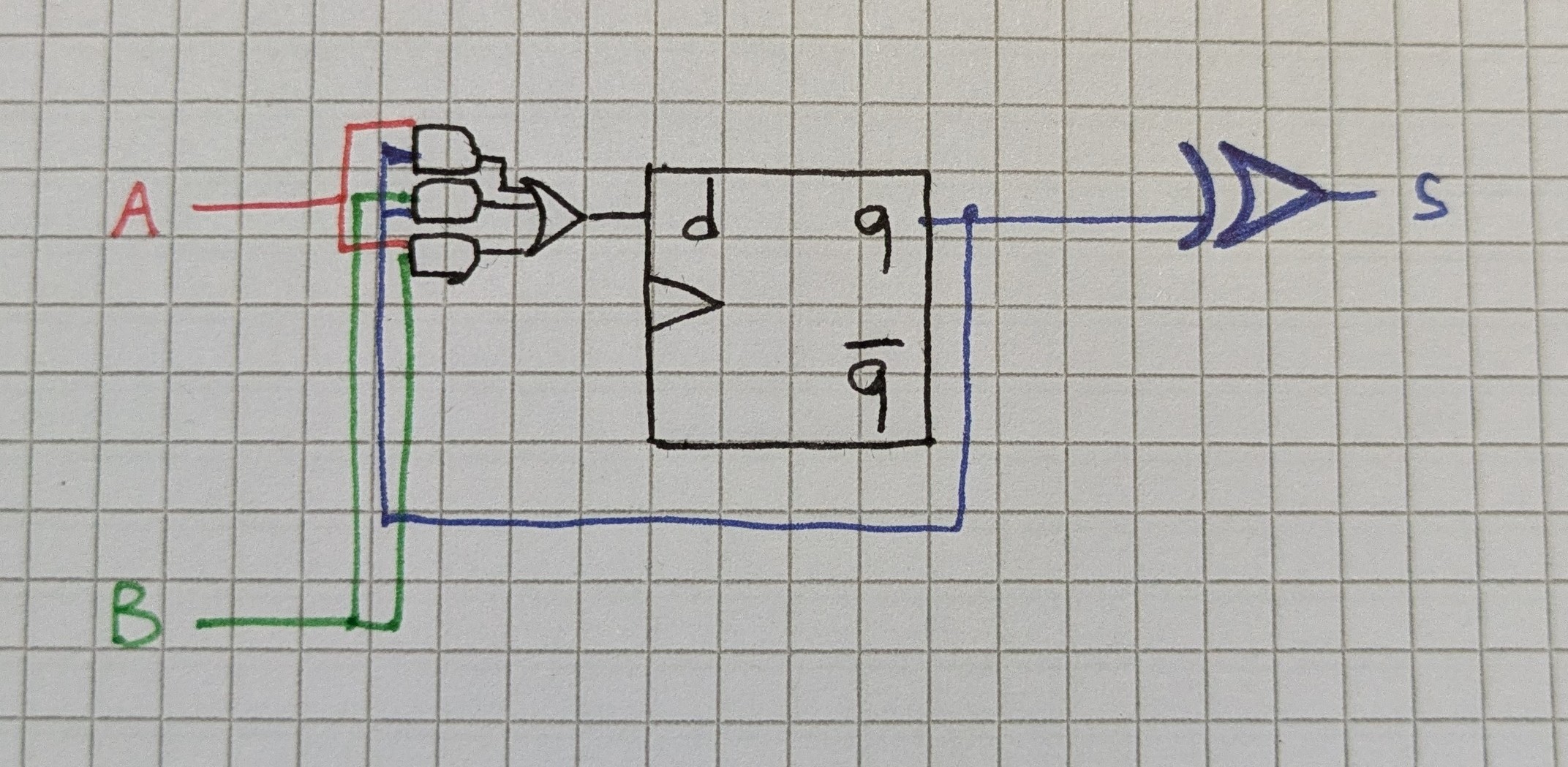Adder sequenziale che somma due numeri arbitrariamente lunghi sommando la cifra n-esima del primo con quella del secondo, producendo in output il singolo bit della somma delle due cifre a ogni iterazione.