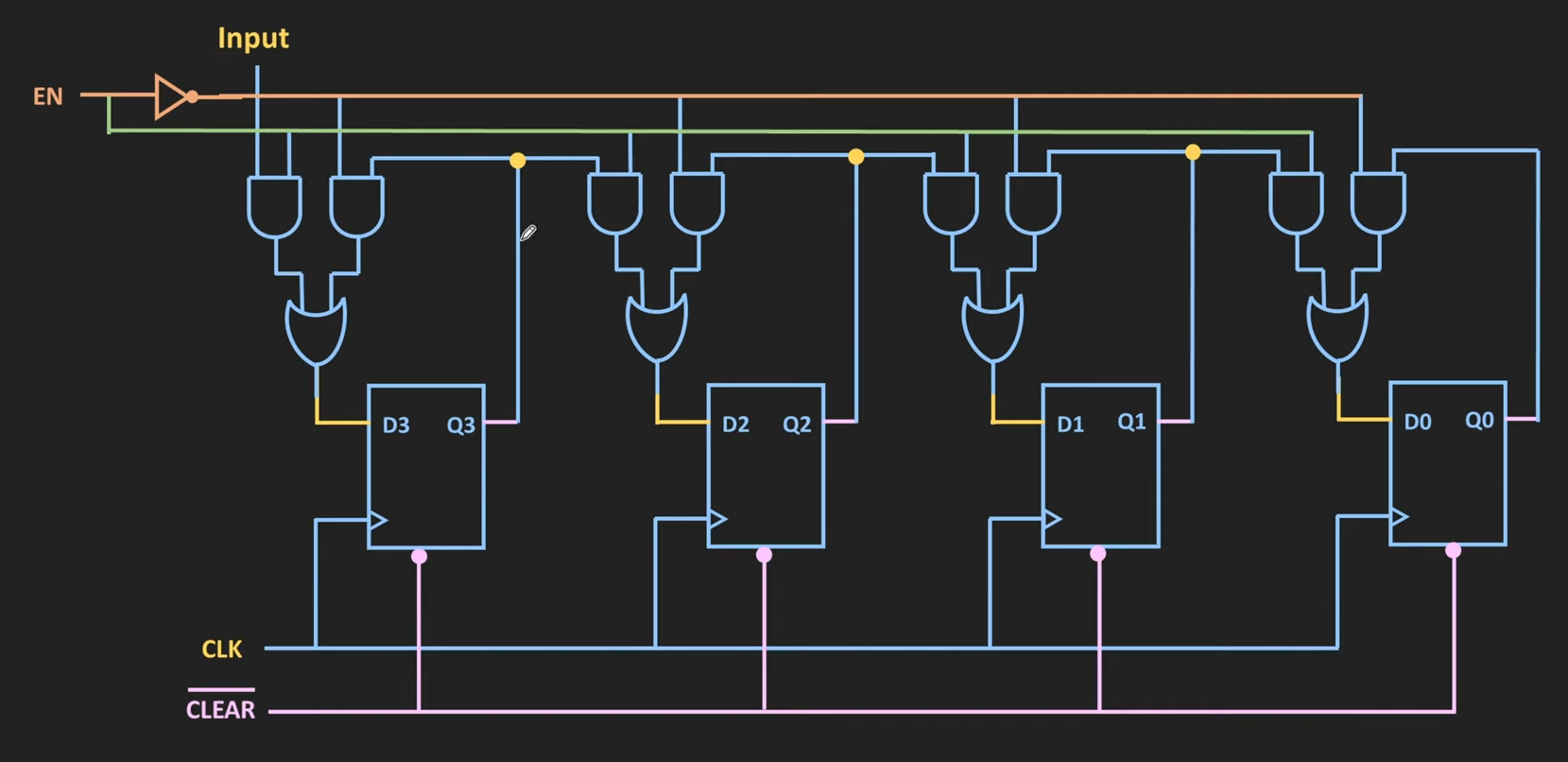 Per questo, come i registri a caricamento parallelo, si introduce una linea di LOAD (EN nell’immagine sotto), ma stavolta, al posto dell’input parallelo, ogni flip-flop riceve come input