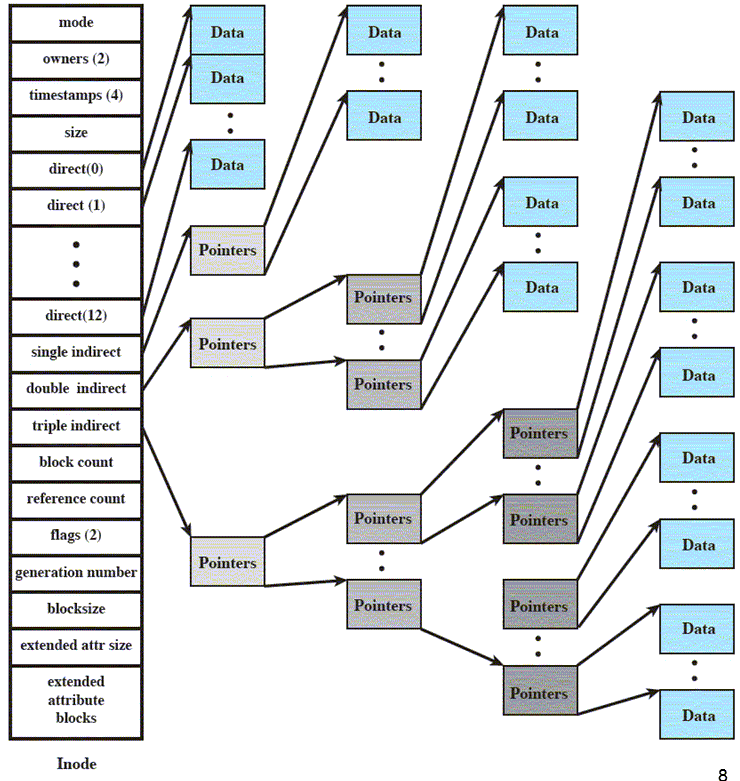 - Data pointers: puntatore alla lista dei blocchi che compongono il file.